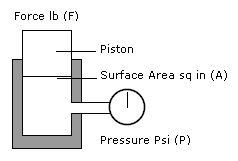 F - Force on Piston (lbf) / A - Area of Piston (in2) = P - Hydraulic Pressure (psi)