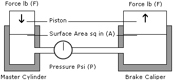 When looking at the two hydraulic laws above we know that the 200 psi in our example system will act equally on all surfaces within the system. The shell of the master cylinder, the shell of the caliper and the hoses that connect them both will have 200 psi acting upon them but they cannot move. However the piston at the caliper is able to move and will have the same 200 psi acting upon it.